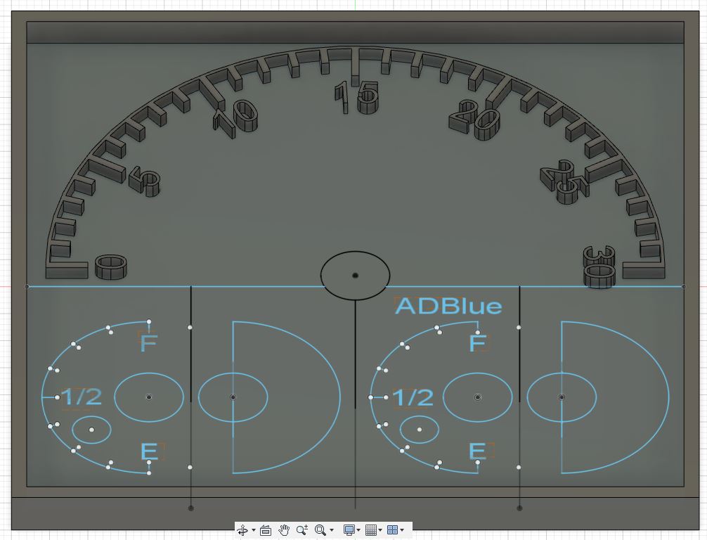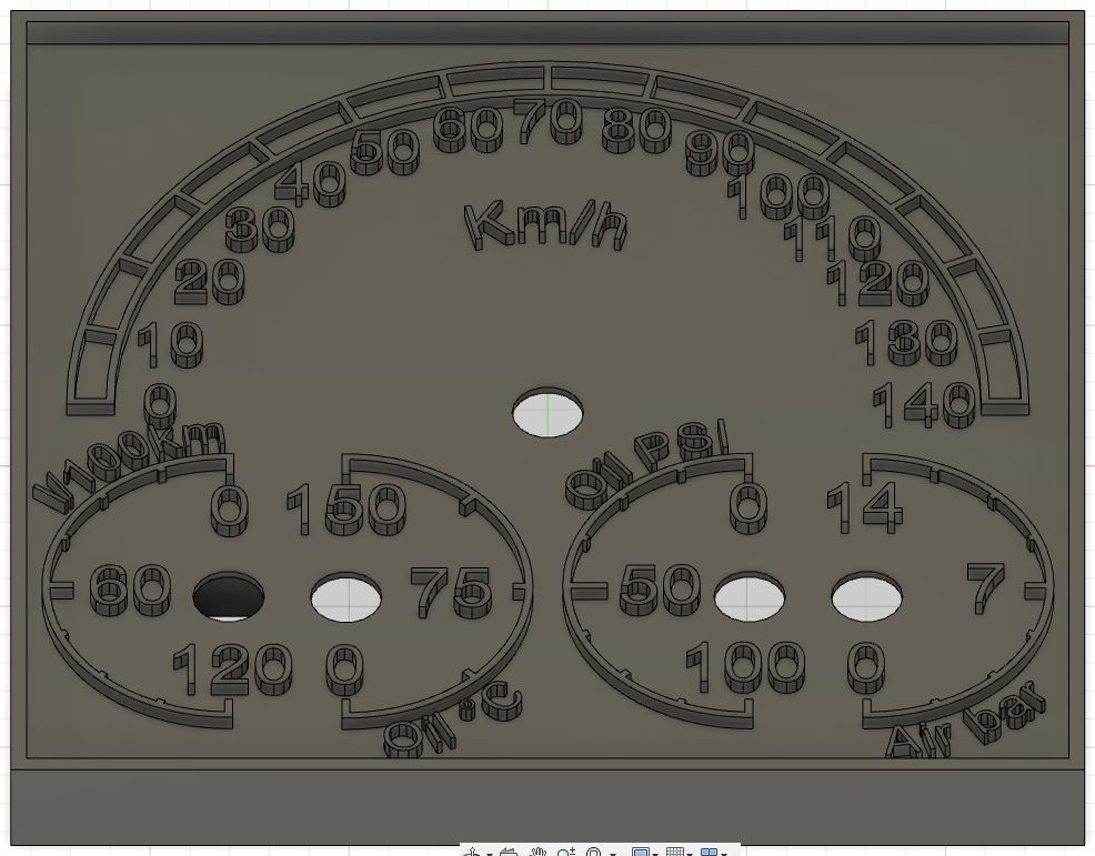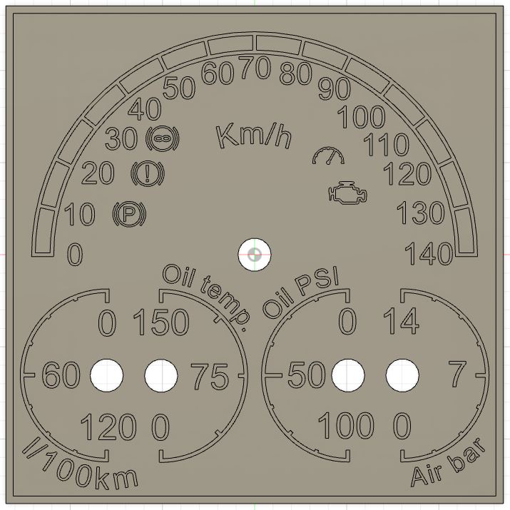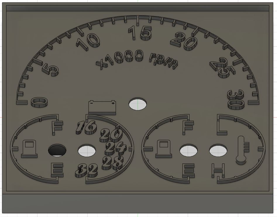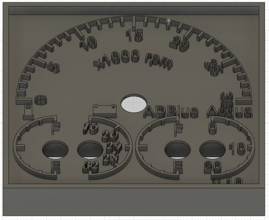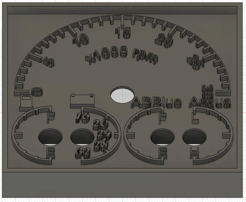 Ingrandito tutte le scritte. Tolta la scritta "Acqua" e messo simbolodel termometro tra L e H, Tolta la scritta ADBlue, sto pensando a cosa mettere. spostato ed ingrandito il simbolo della pompa. Fatto gli spazi per i led per riserva benzina e warning batteria.
