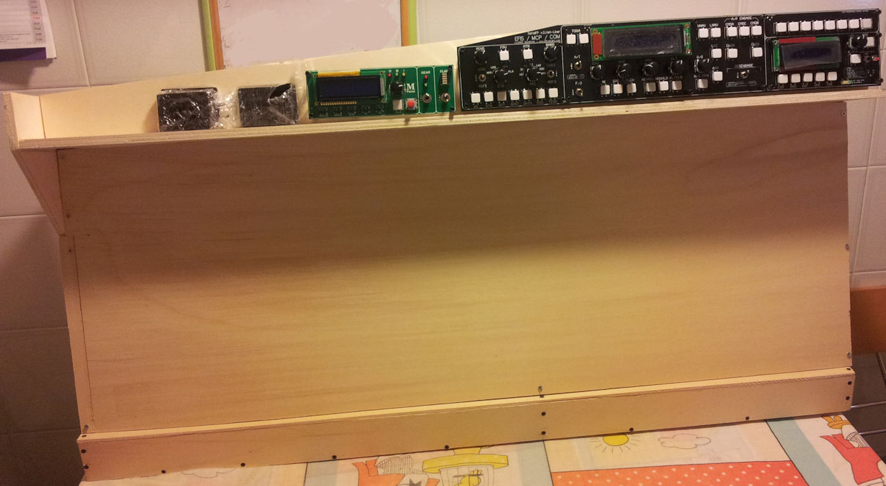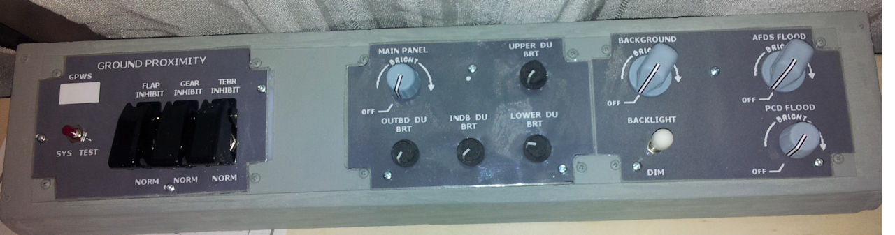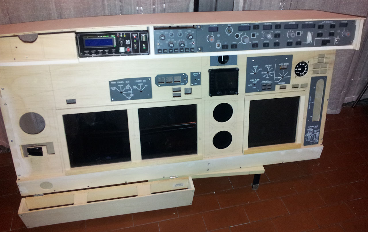 Nella seconda e quarta foto, in alto a destra, e' l'apparato hardware che abbiamo preso il quale faceva da EFIS, MCP e COM (2012). Subito a sinistra il primissimo apparato comprato per pilotare Flight Simulator (controllavamo flap, gear, com, nav, adf e l'autopilota). più a destra abbiamo gli indicatori pulsanti (System Annonciator Light) di destra e sinistra, visto che la postazione del primo ufficiale non la facevamo avevamo bisogno anche degli annunciatori di destra.
