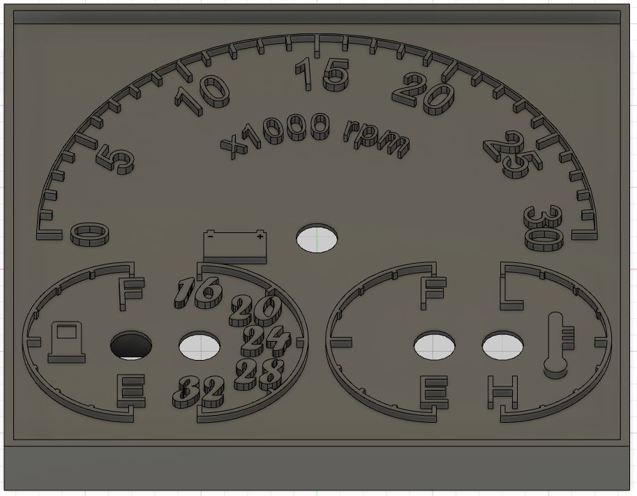 Ingrandito tutte le scritte. Tolta la scritta "Acqua" e messo simbolodel termometro tra L e H, Tolta la scritta ADBlue, sto pensando a cosa mettere. spostato ed ingrandito il simbolo della pompa. Fatto gli spazi per i led per riserva benzina e warning batteria.